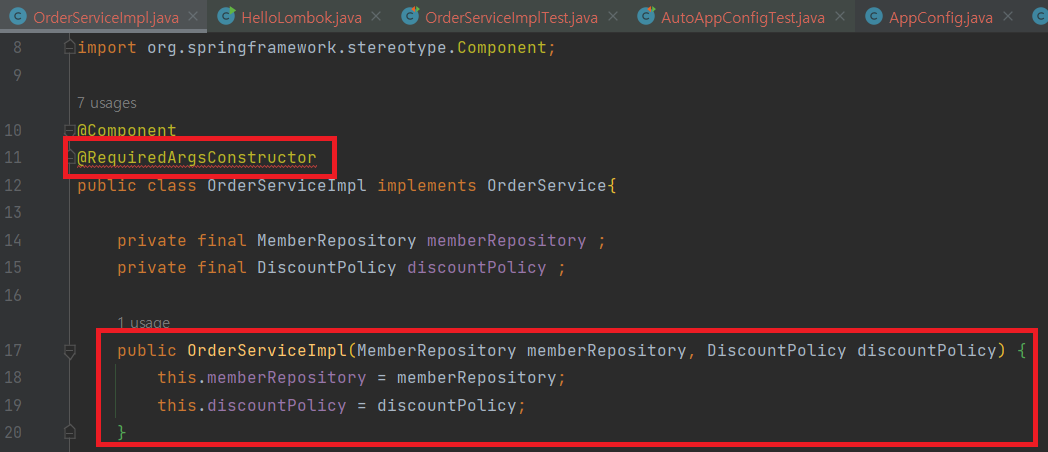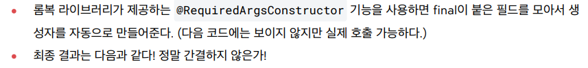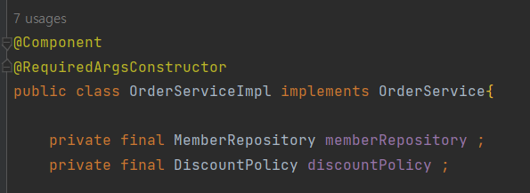 객체 OrderServiceImpl에 final이 붙은 필드를 파라미터로 받는 생성자를 만들어 줌