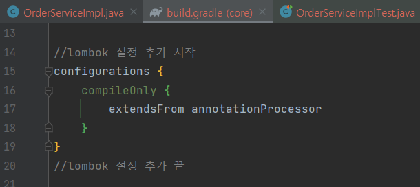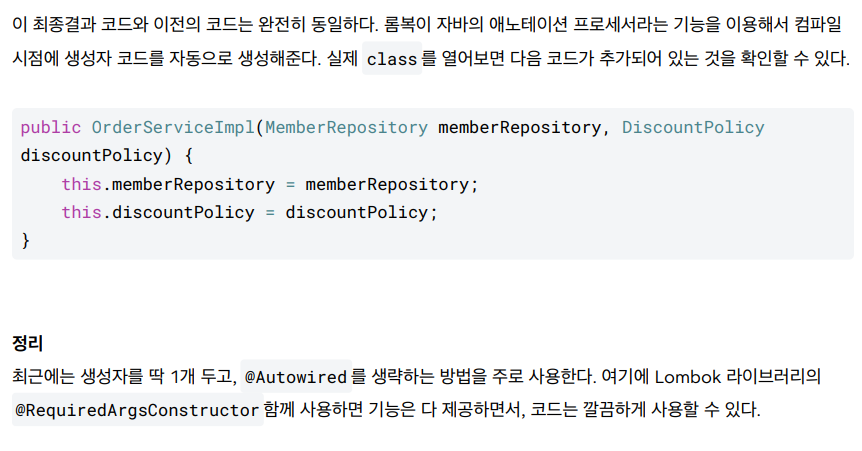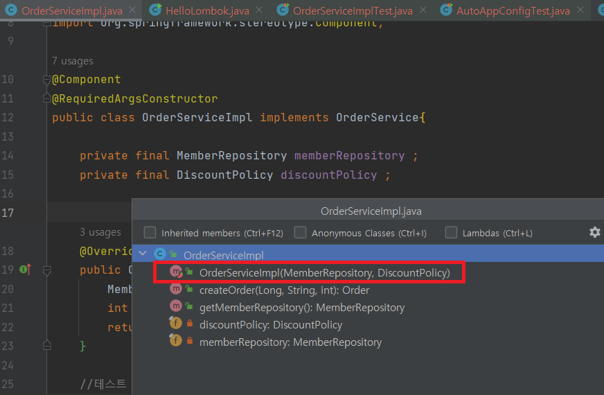 객체 OrderServiceImpl에 final이 붙은 필드를 파라미터로 받는 생성자를 만들어 줌
