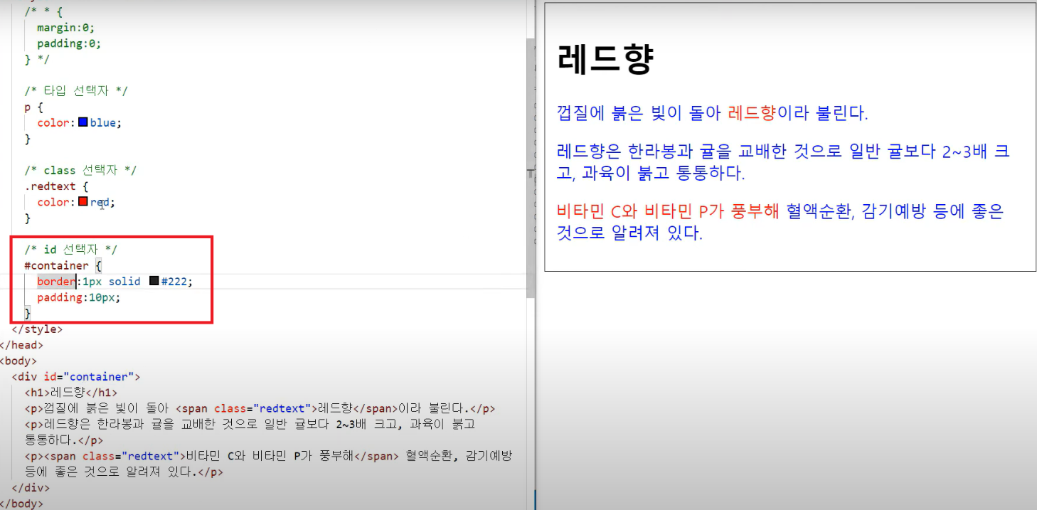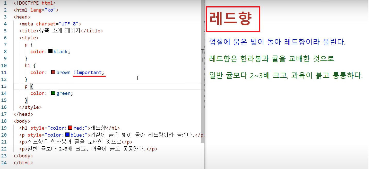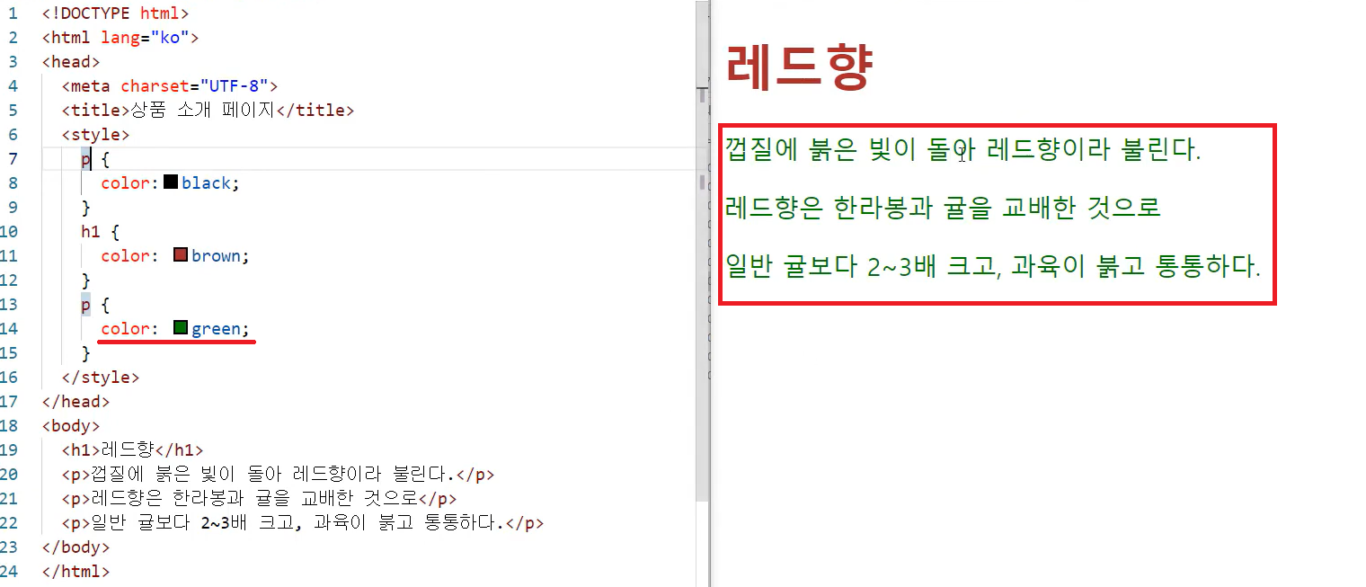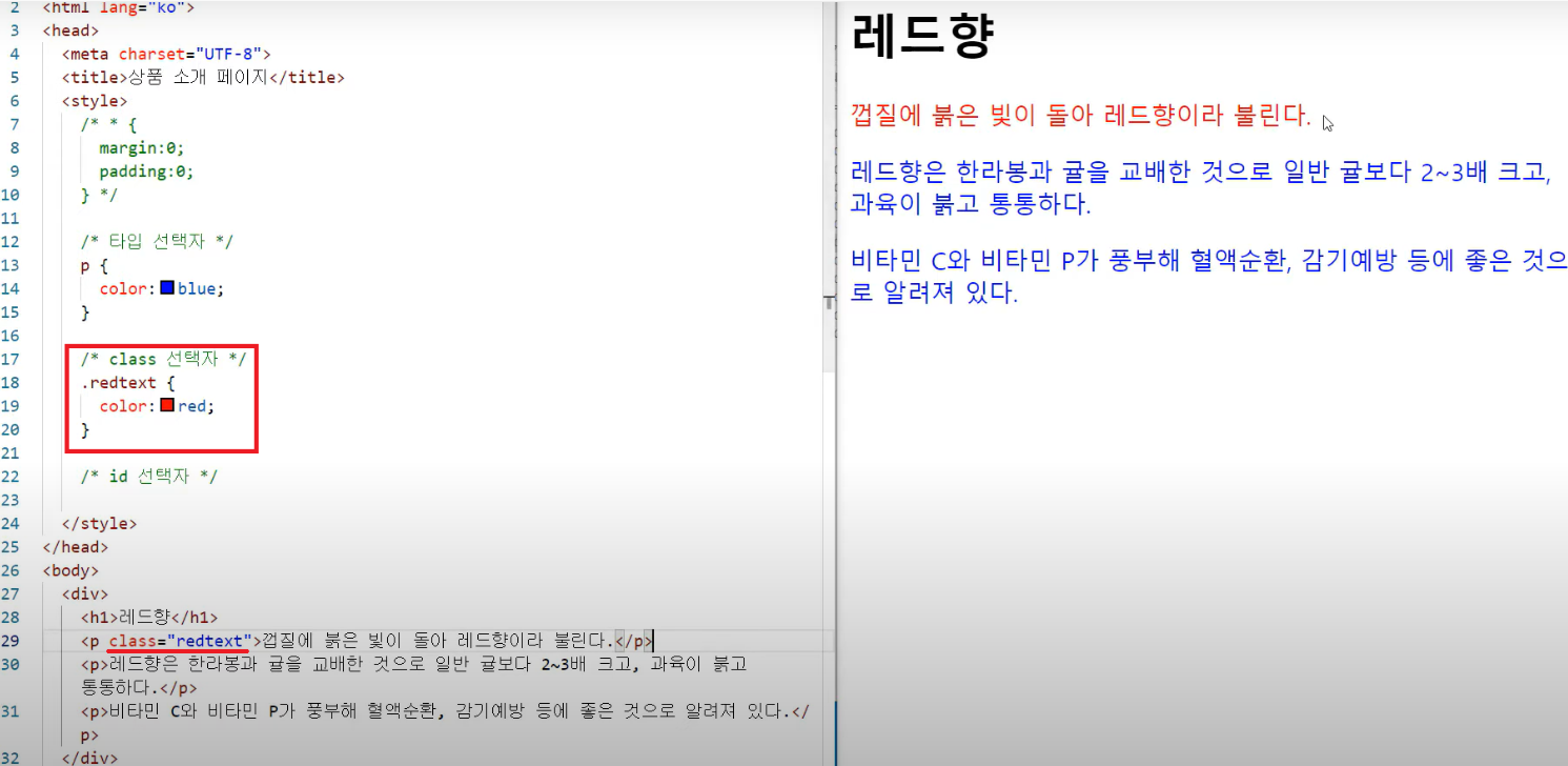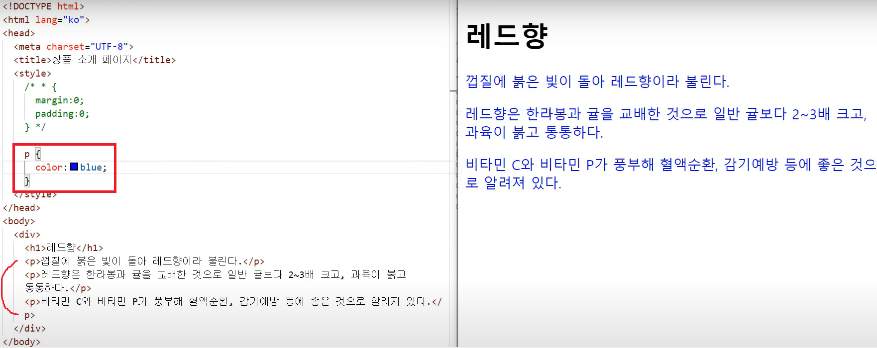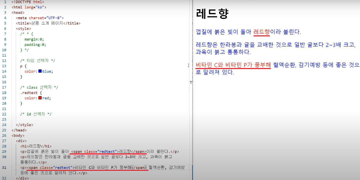 위와 같은 예제에서 "레드향"이라는 글자 일부에만 적용하고 싶은경우 <span>태그를 사용하여 묶어 줌