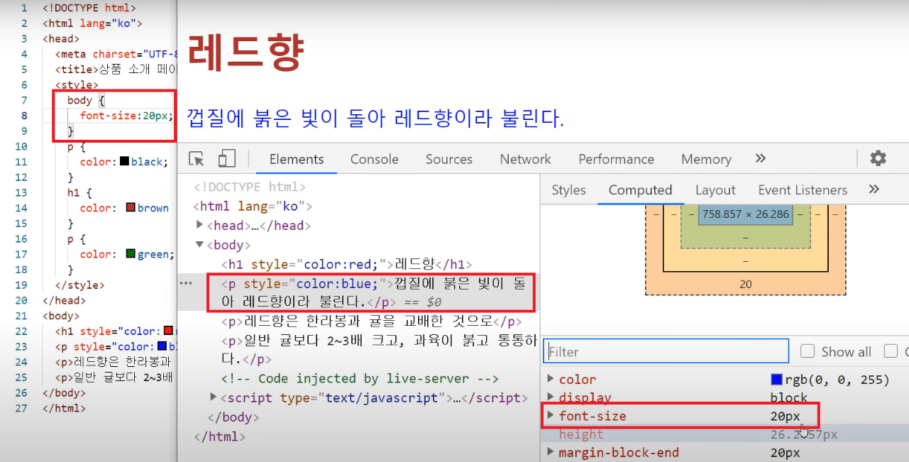 상속 : body의 font-size를 20px로 설정하였는데 p태그의 폰트사이즈에 적용됨을 볼 수 있음