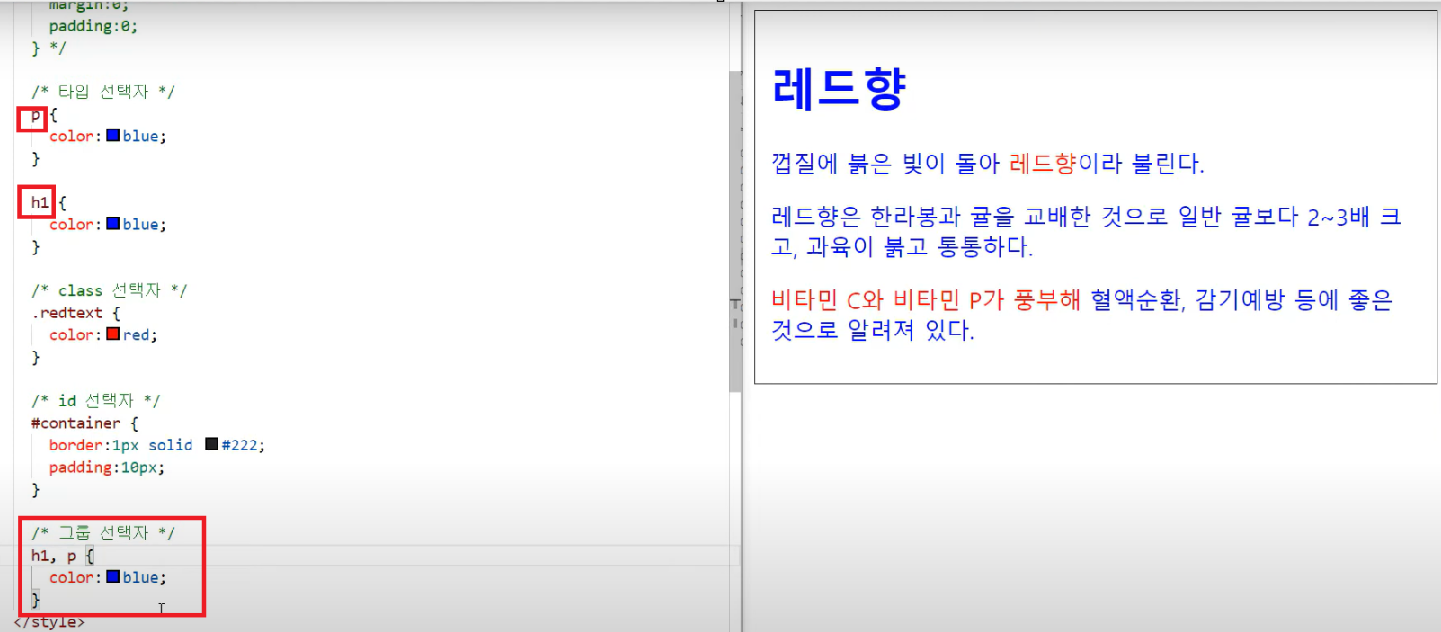 그룹 선택자 : 같은 스타일 규칙을 가진 선택자를 그룹으로 묶어 나열 가능