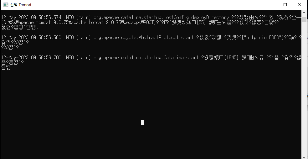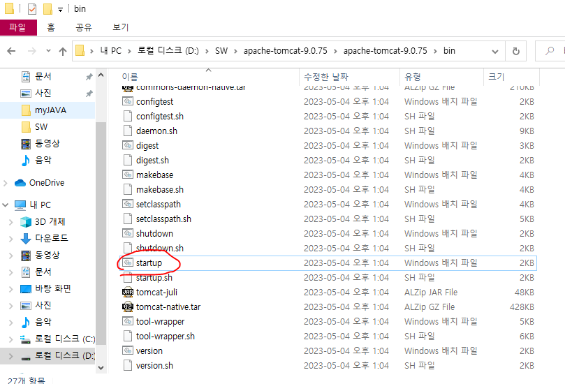 apache-tomcat폴더 -> startup을 클릭하면 아래 tomcat검은화면?이 뜬다.