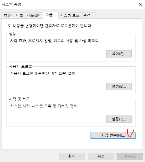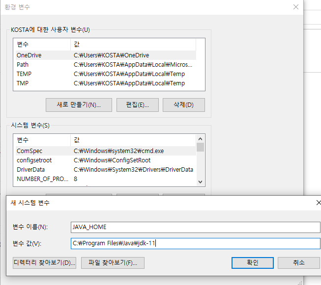 시스템속성 -> 환경변수-> JAVA_HOME -> 변수 값에는 JDK가 저장되어있는 폴더 경로 지정