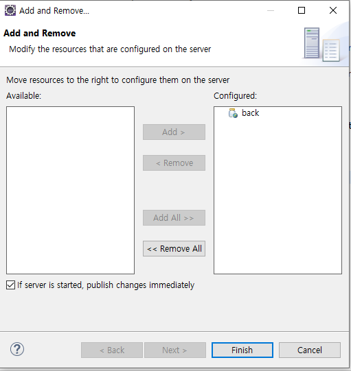 Available에 있는 project명(back)을 오른쪽으로 Add시킴 (톰캣에 올리는 과정)
