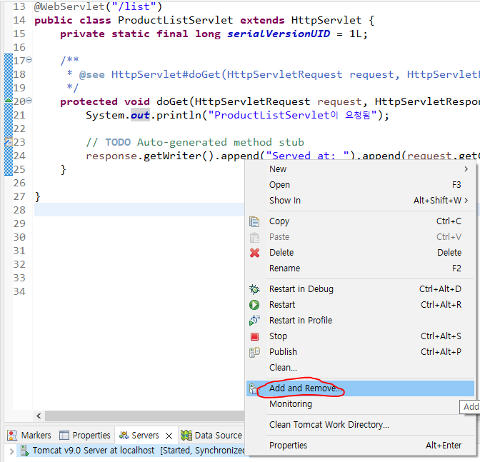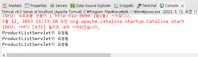 올리고나면 console에 아래와같이 Servlet이 요청되었다고 뜬다.