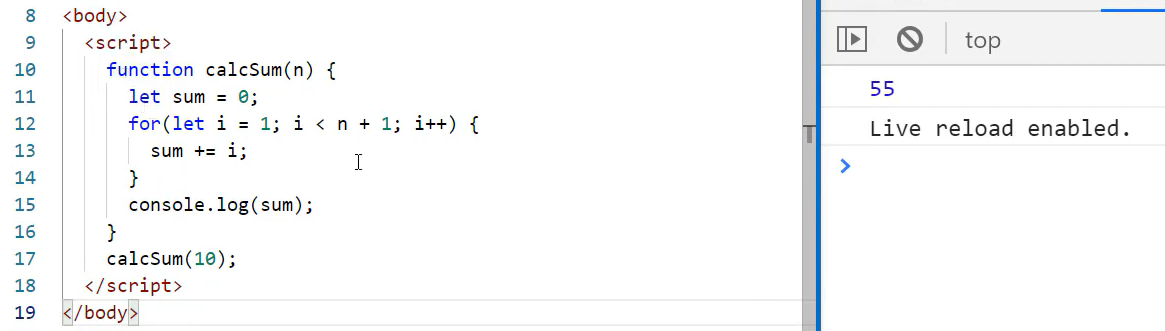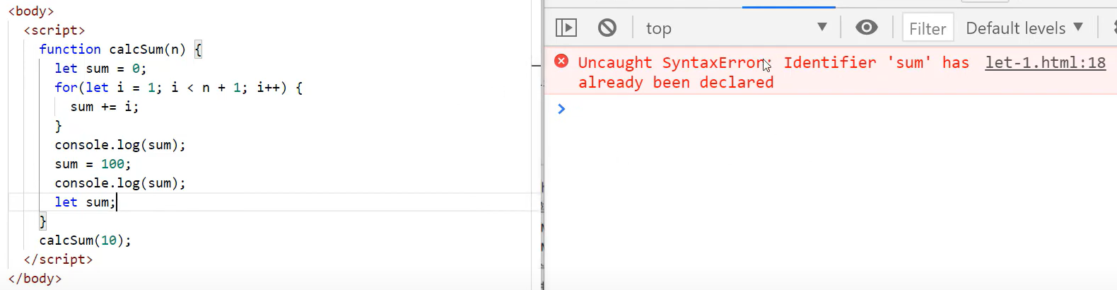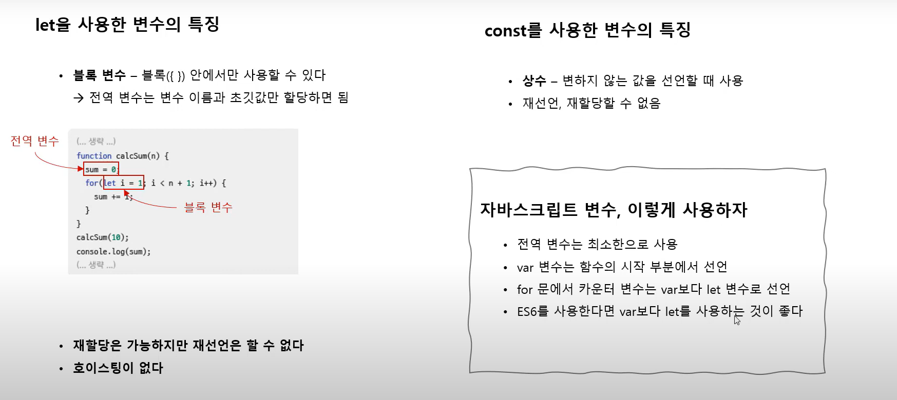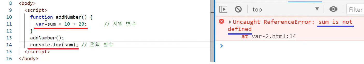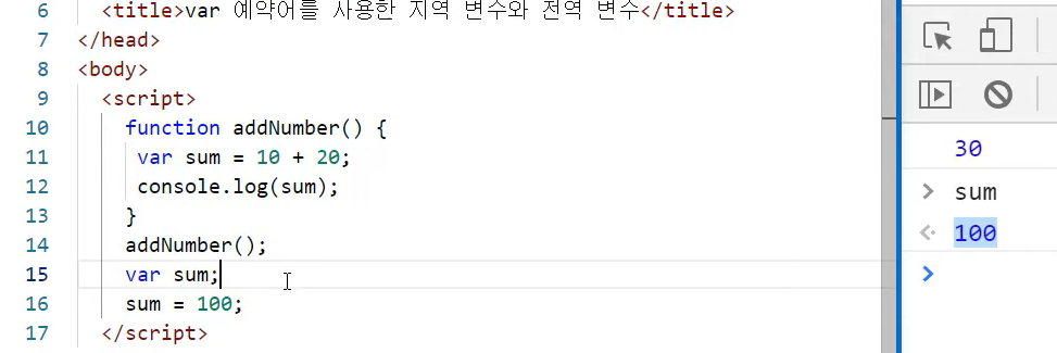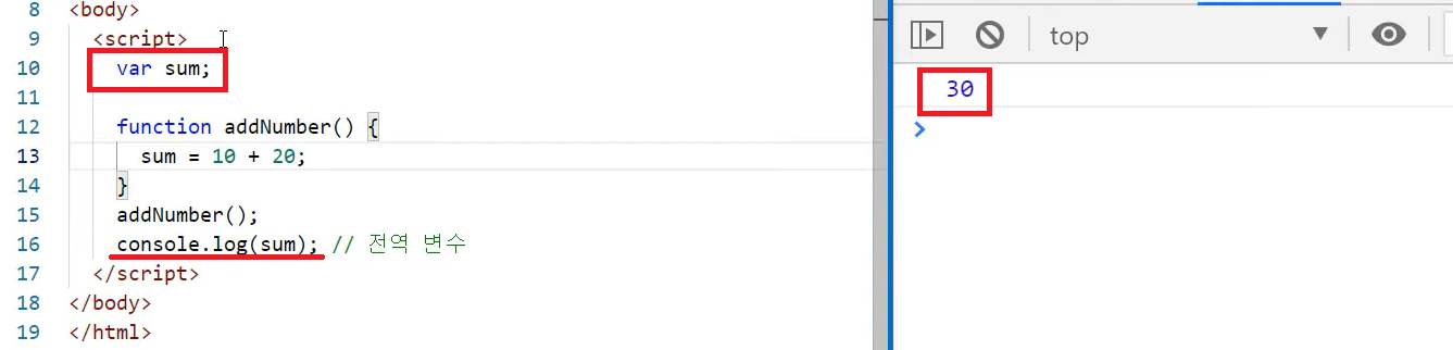 let sum은 calcSum 함수 내에서만 사용 가능. let를 빼면 sum을 전역 변수로 사용 가능