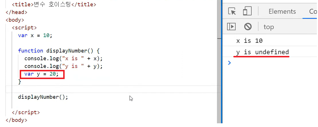 y변수가 선언 되지 않았지만 undefined로 나오는 이유는 앞에 선언 된것처럼 끌어서 인식 함