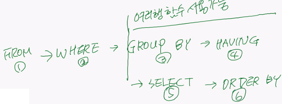 GROUP BY절에서 사용한 컬럼만 SELECT절에서 여러행 함수와 함께 사용 가능