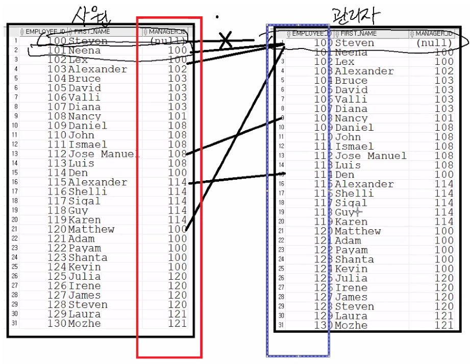 사원의 사번, 이름, 관리자번호, 관리자 이름을 출력하시오 (106건)