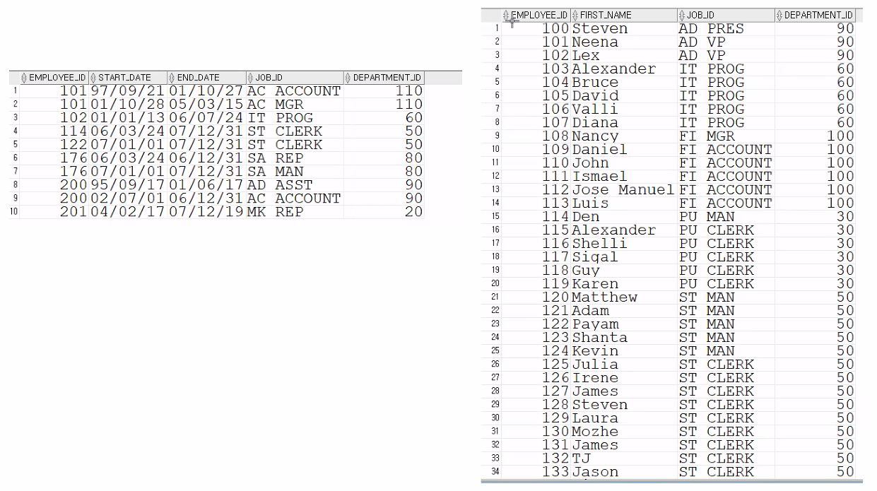 FROM employees JOIN jobs ON (employees.job_id = jobs.job_id);