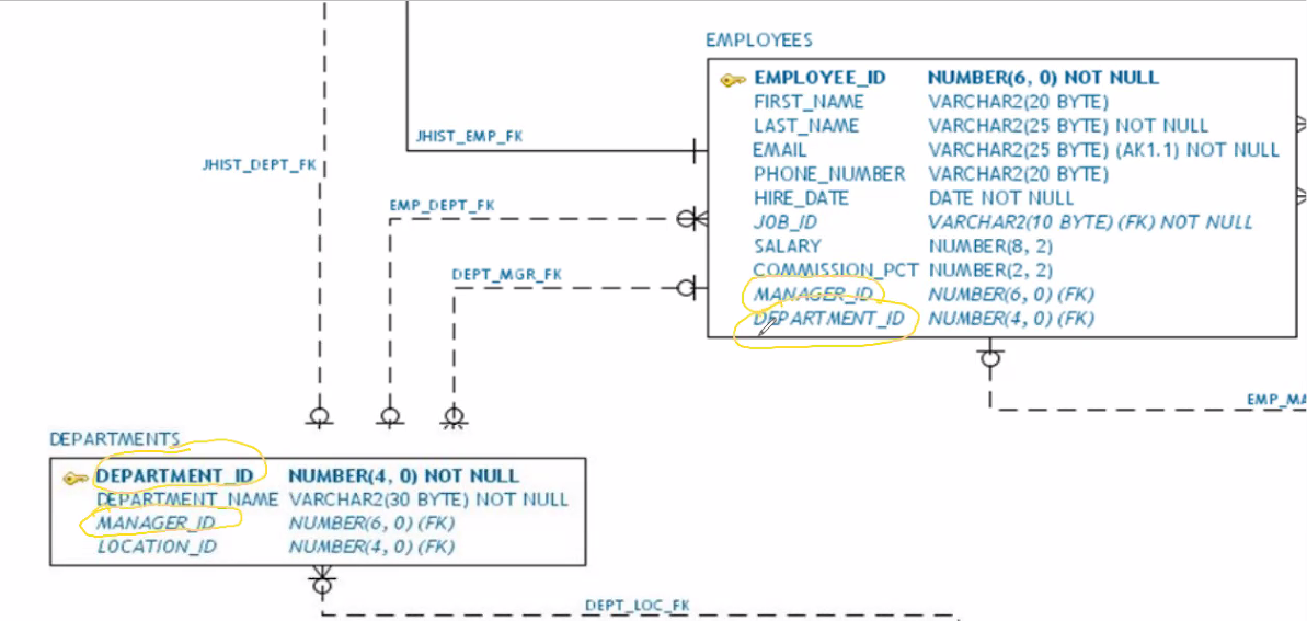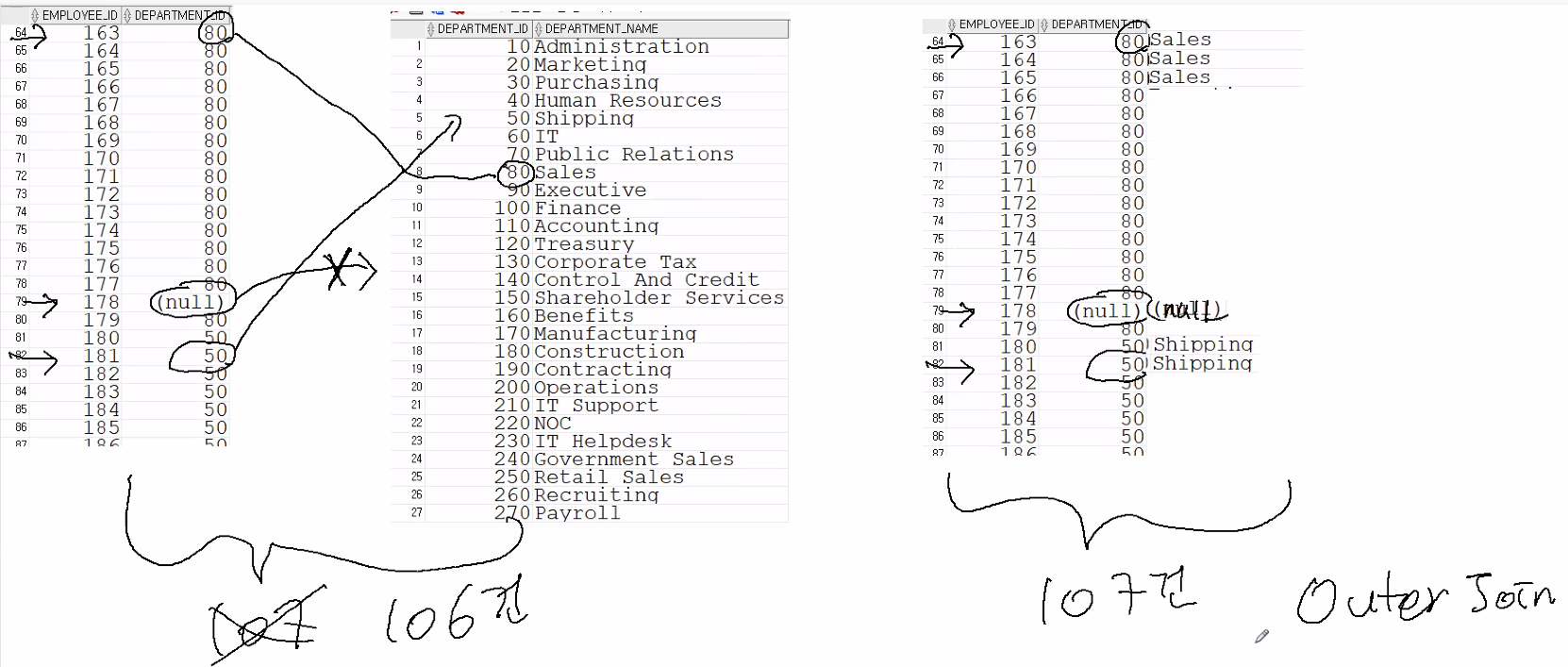 FROM employees LEFT OUTER JOIN departments --LEFT, RIGTH있는 경우 OUTER생략가능