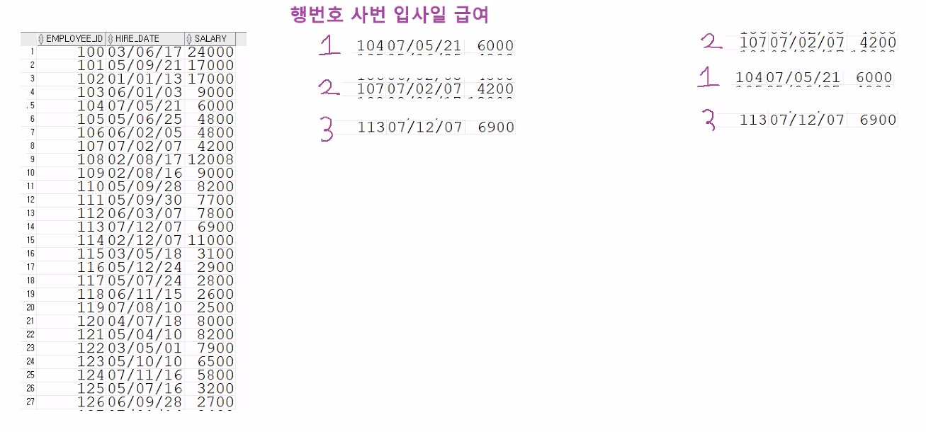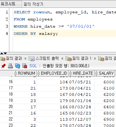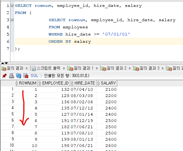 => SELECT rownum 처리 후 ORDER BY salary 순서로 처리되었기 때문에 ROWNUM순차는 뒤섞이게 됨.