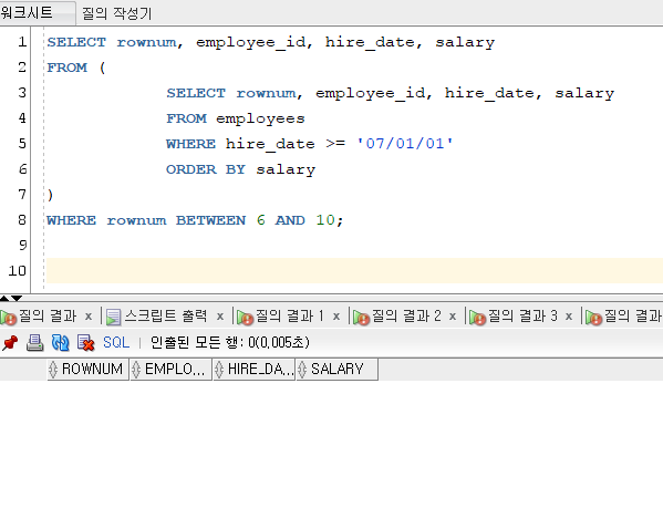 => WHERE rownum BETWEEN 6 AND 10; -- WHERE절 초기값은 1인데 6AND10 조건에 맞지 않아