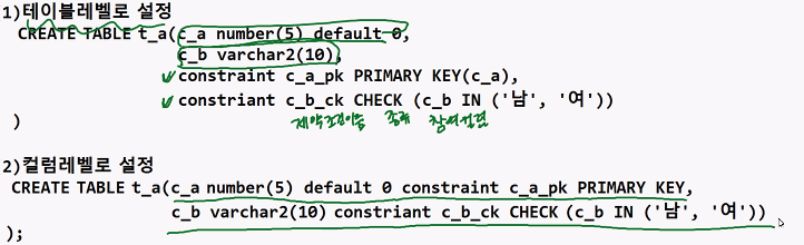 그 중 NOT NULL제약 조건은 컬럼 레벨로만 설정 할 수 있다