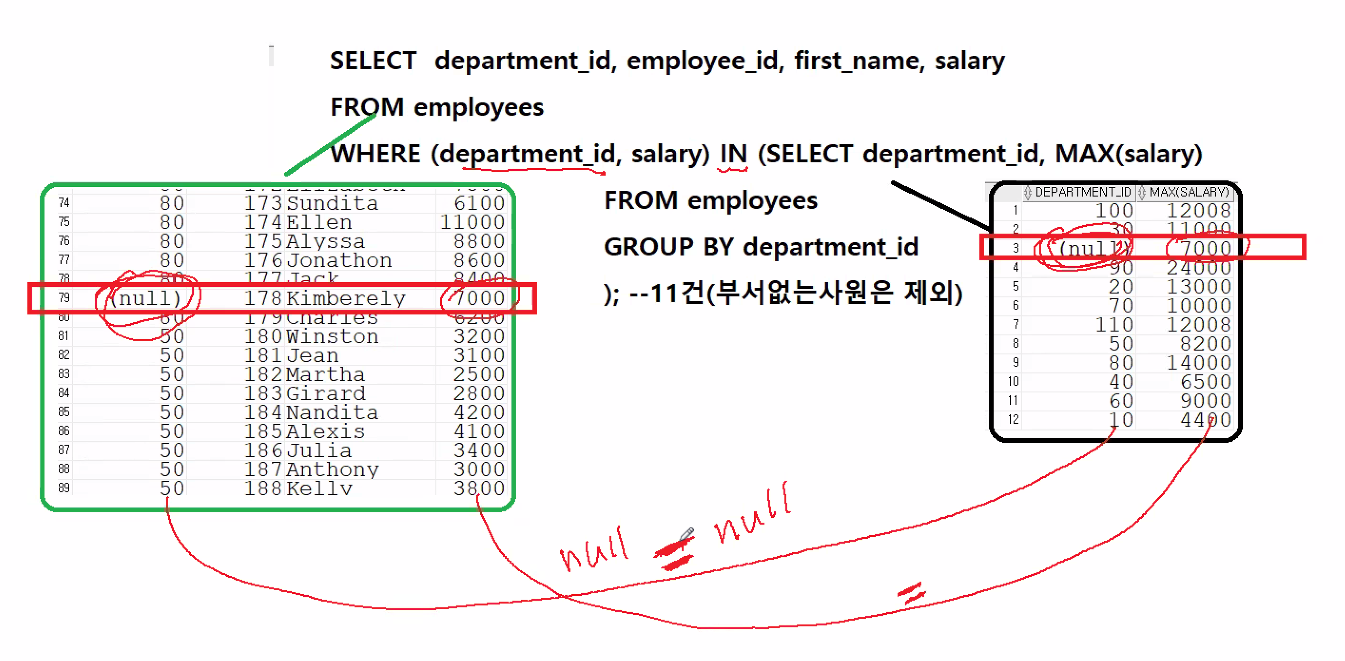 WHERE (NVL(department_id, 0), salary) =ANY (SELECT NVL(department_id, 0), MAX(salary)