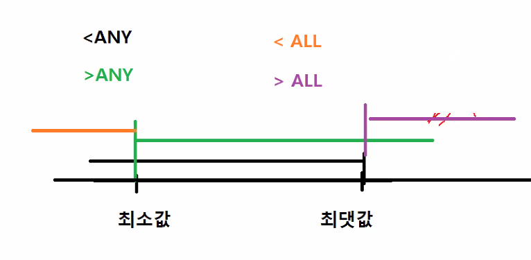 = ANY는 IN과 같음, >ANY : 최소값보다 크다, <ANY : 최대값보다 작다