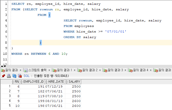 => WHERE rownum BETWEEN 6 AND 10; -- WHERE절 초기값은 1인데 6AND10 조건에 맞지 않아