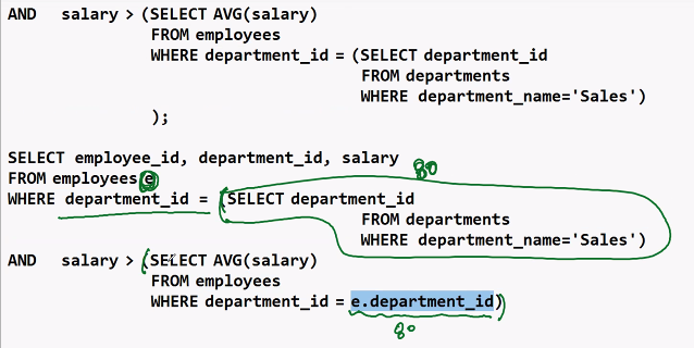 WHERE (NVL(department_id, 0), salary) =ANY (SELECT NVL(department_id, 0), MAX(salary)