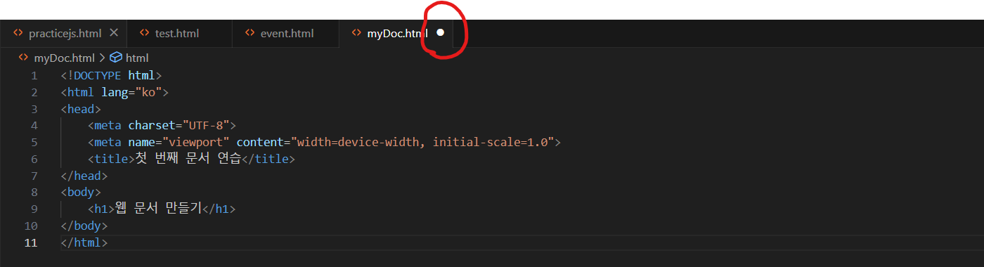 VS code에서 작성중일때 위에 표시한 모양이 떠있는데, 저장이 안된 상태이며 저장하면 저 표시가 사라짐.!
