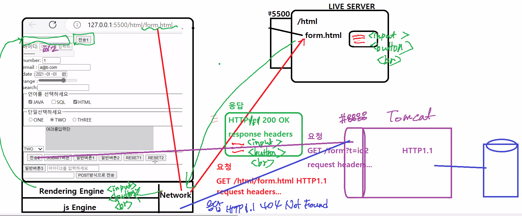 form태그 안에서는 전송버튼, form태그 밖에서는 일반 버튼.