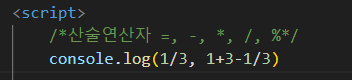 1/3 (정수/정수) : 자바 결과 값 0, 자바스크립트 결과 값: 0.3333.. (실수로 나옴)