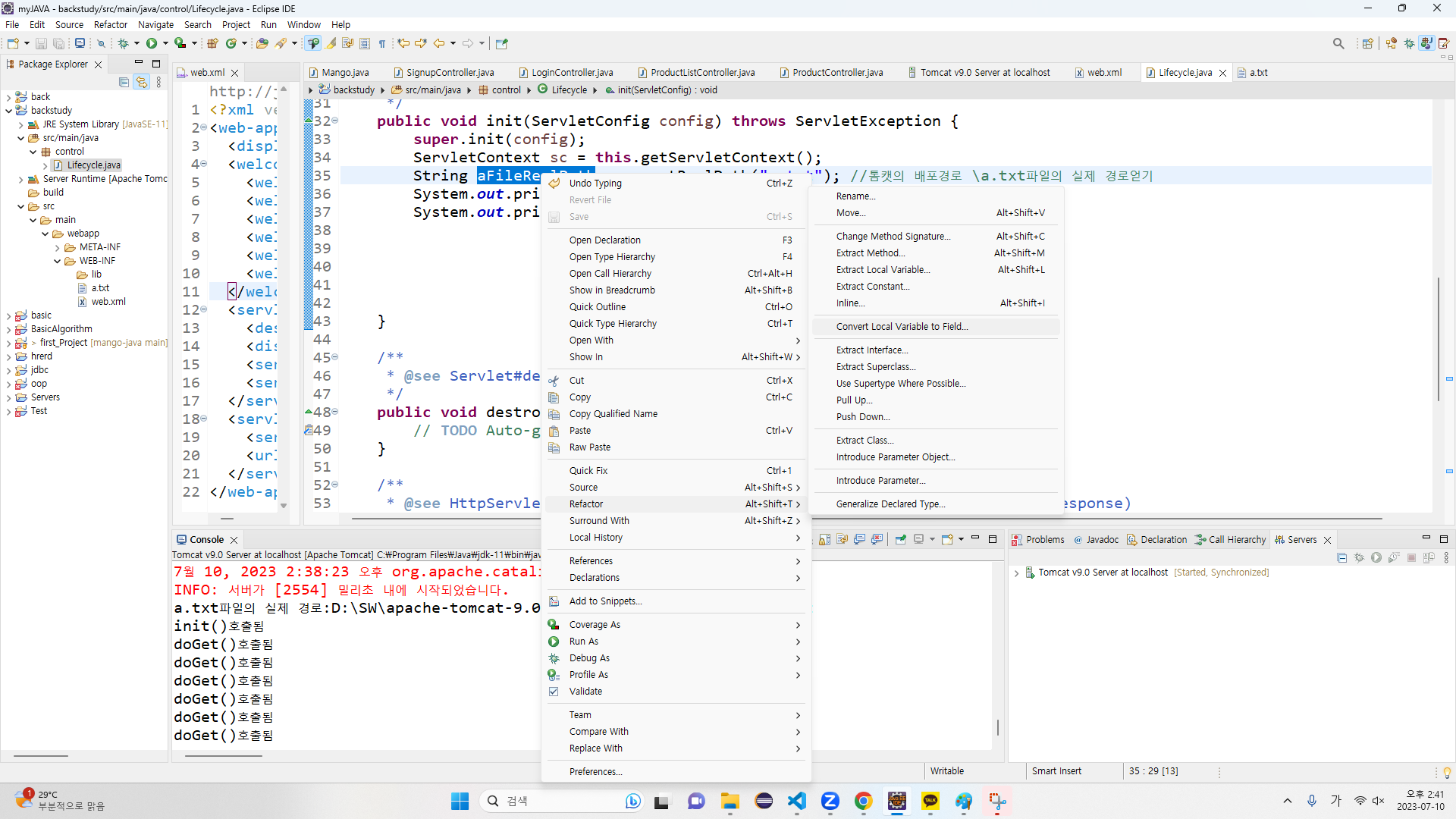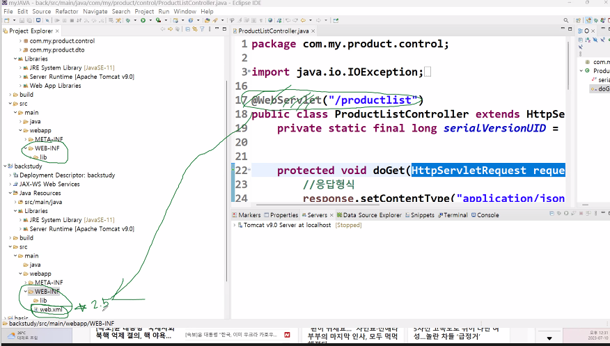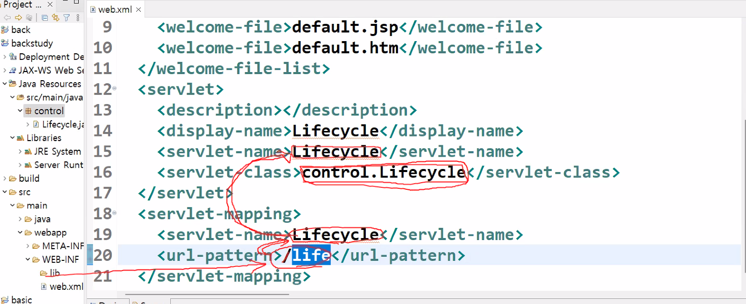 이제 생성된 서블릿 web.xml에서 등록하고 mapping하기