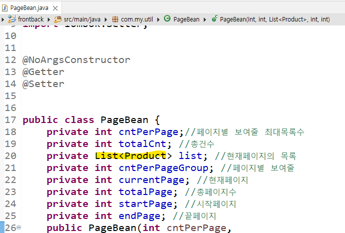 productlistresult.jsp파일에서는 직접 계산 하지 않고, getter()로 PageBean에 값(startpage/endpage)얻어옴