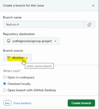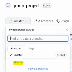 master에서 develop으로 변경된 것을 확인 할 수 있음