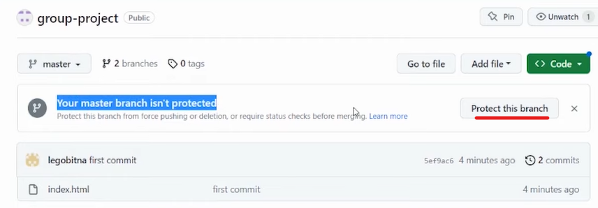 master branch는 코드를 push하고 수정할 수 없고, 개인이 바꿀 수 없도록 보호필요