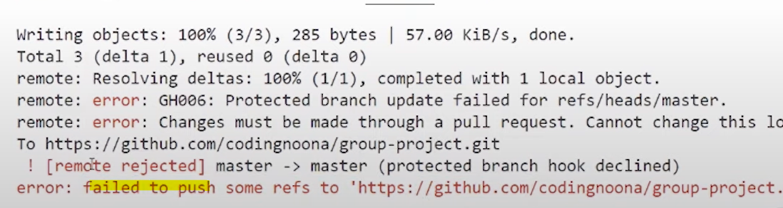 git checkout master 후 git push 하면 아래와 같이 에러가 뜬다.