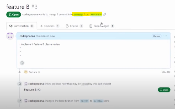 master에서 develop으로 변경된 것을 확인 할 수 있음