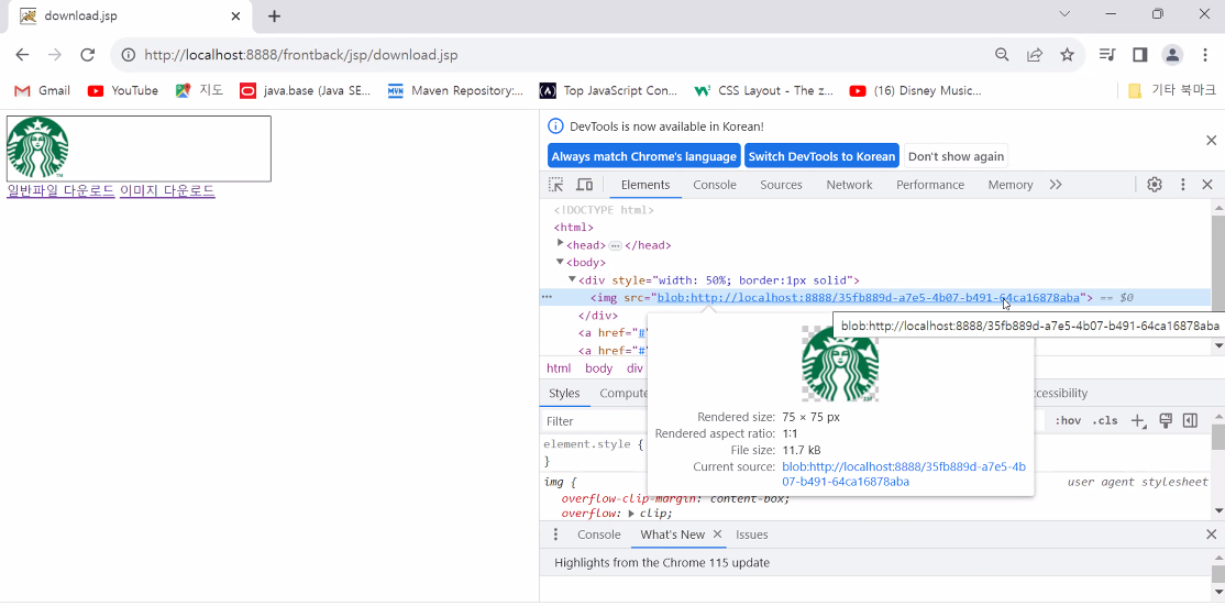 이미지다운로드 링크를 누르면 ajax요청. attach형태로 첨부되어 클라이언트가 쓰게 할 것이아니고 무조건 응답 받게 함.