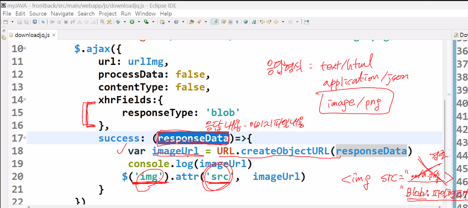 응답파일 내용을 파일로 만들어주어야 함 => URL.createObjectURL
