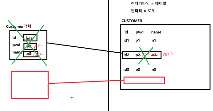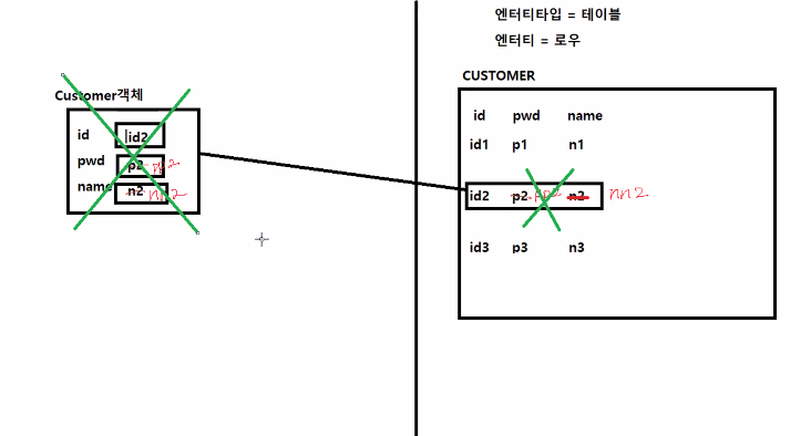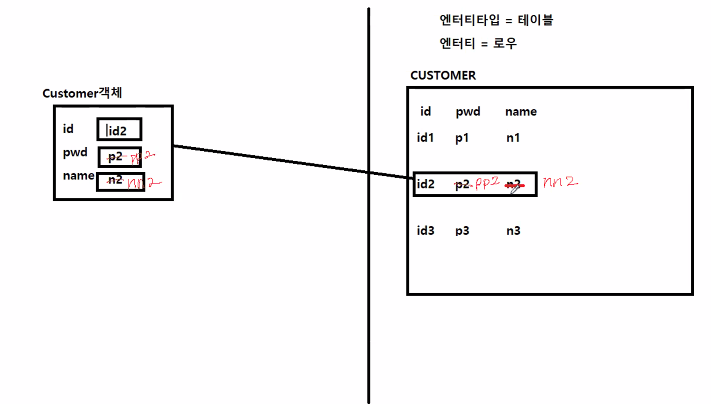객체 멤버변수 값이 바뀌면 엔터티가 바뀌고, 엔터티가 바뀌면 객체도 바뀌는 구조