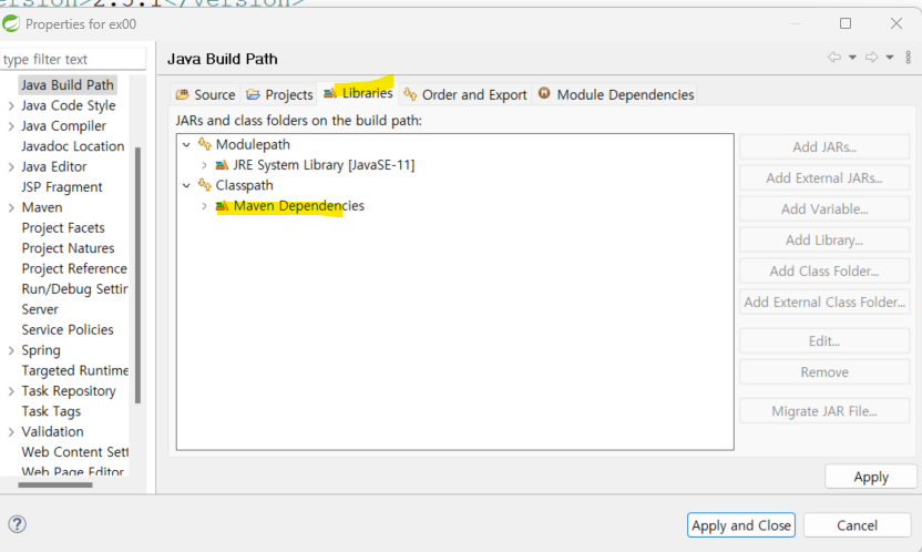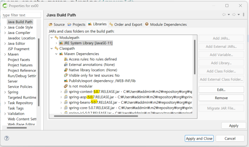 버전을 5.0.7로 변경한 뒤 Build Path에서 maven libraries확인 하면