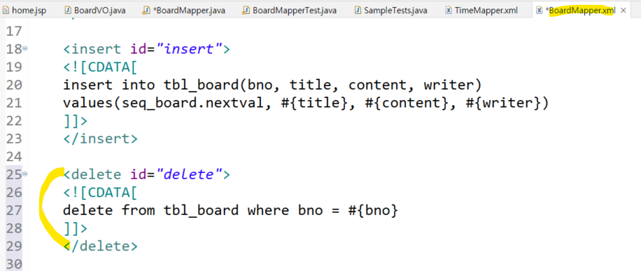 Mapper에 쿼리문 넣는것은 좋은 방식이 아님. xml파일에 따로 빼준다.