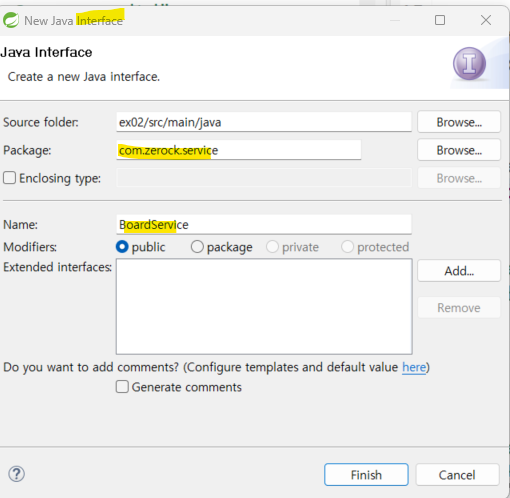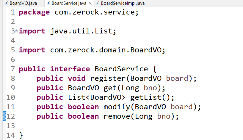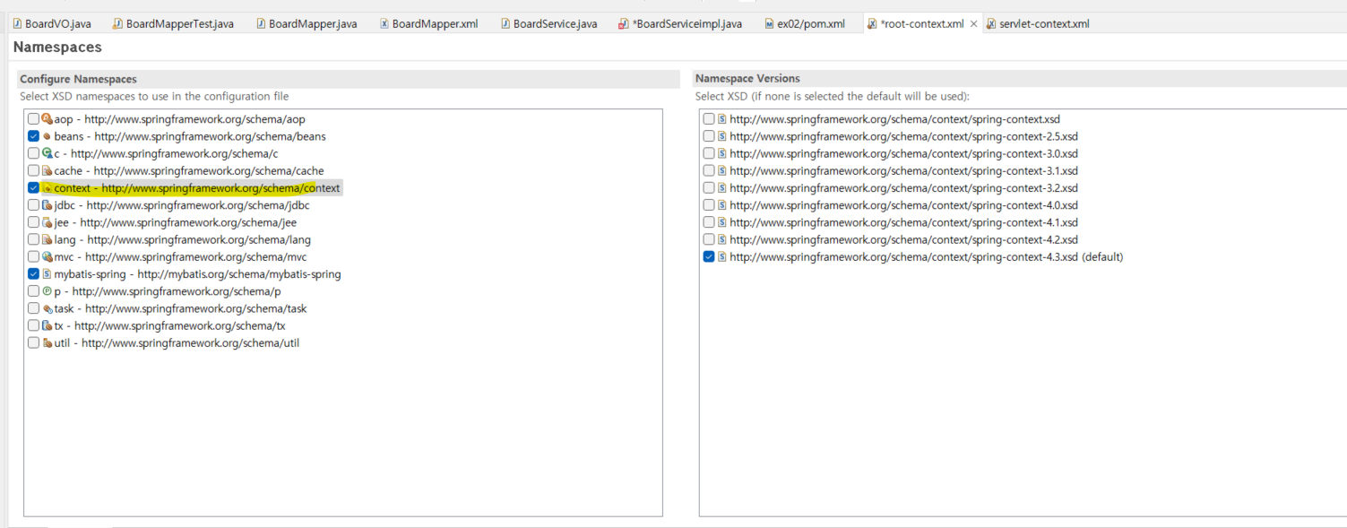 비즈니스 계층의 인터페이스와 구현 클래스가 bean으로 인식되게 하기 위해 @Service 어노테이션이 있는 com.zerock.service패키지를 스캔하도록 root-context.xml에 추가 필요