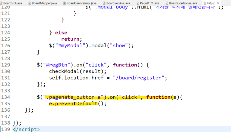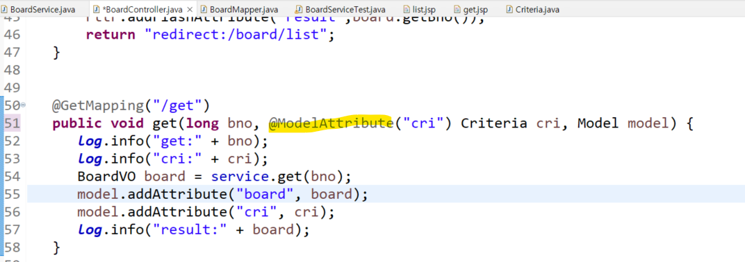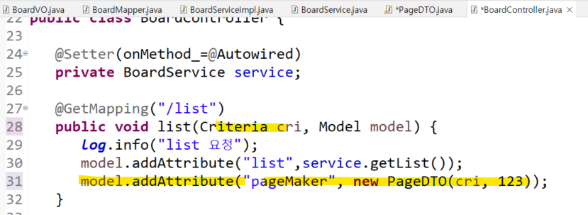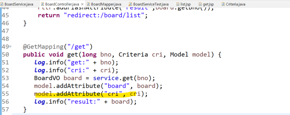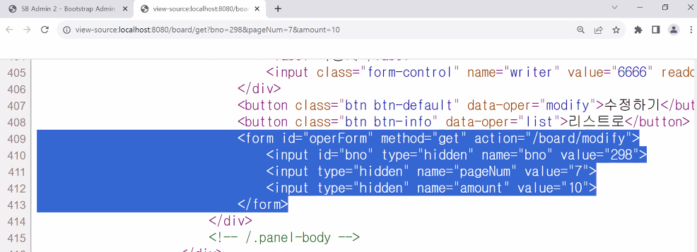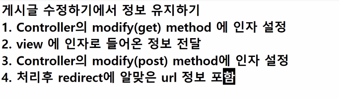수정하기 버튼 -> 컨트롤러로 전달 -> 객체를 인자로 받아 업데이트.jsp로 넘겨줌 -> 컨트롤러로 다시가서 criteria에있는 pageNum과 amount를 추가하여 리디렉트 -> 인자를 연결하여 처리