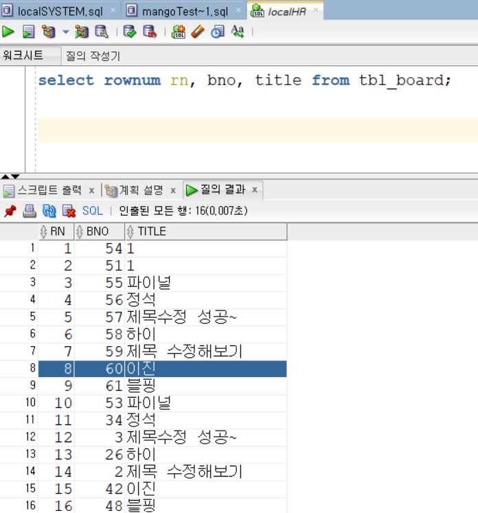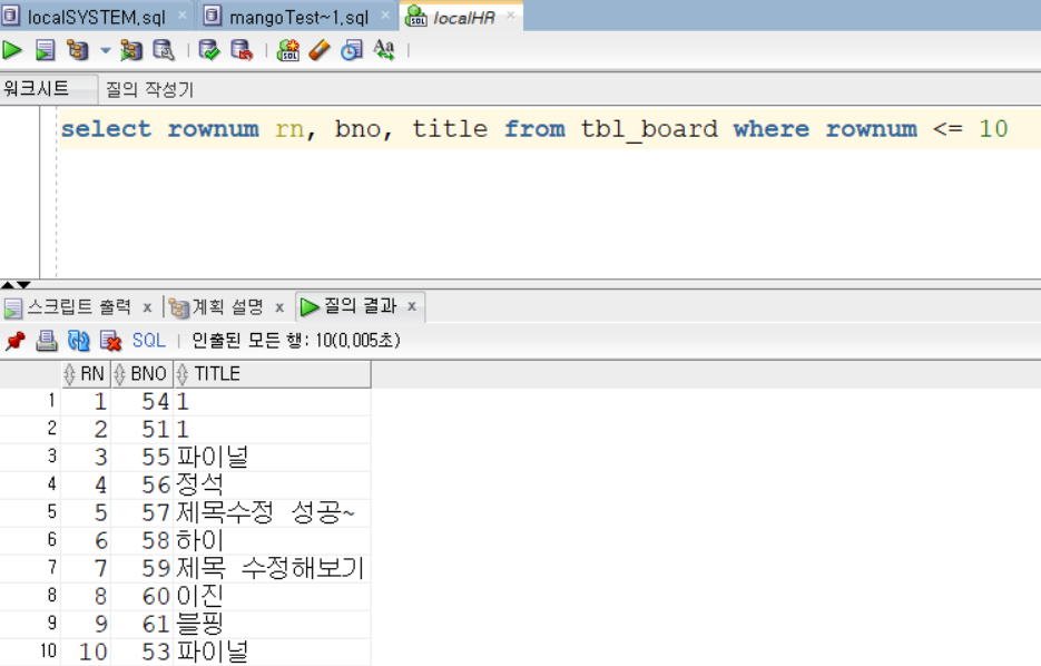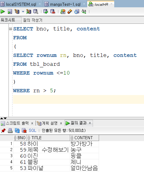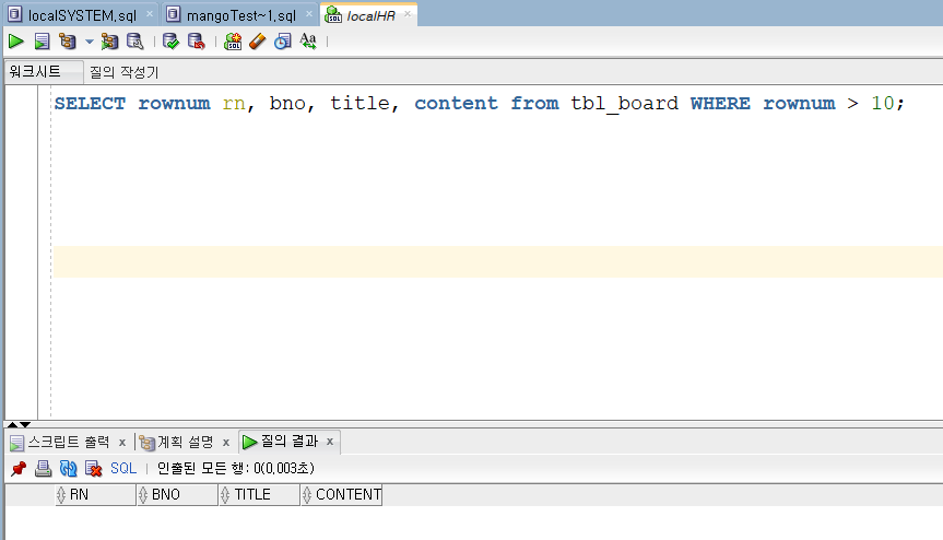 SELECT rownum rn, bno, title, content from tbl_board WHERE rownum > 10;