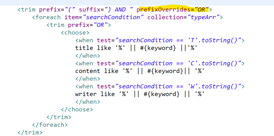 제일 앞에 or가 필요 없으므로 prefixOverrides="OR" 를 추가해줌