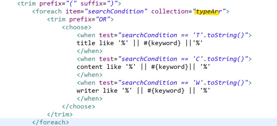 item= "searchCondition"과 test="searchCondition"이 일치해야 함