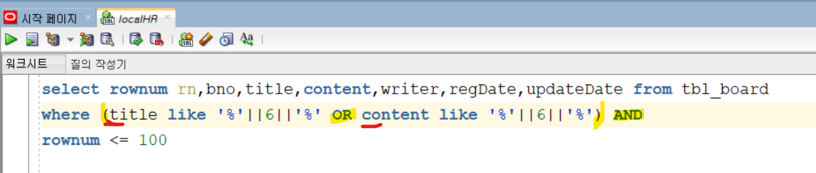 AND 와 OR 우선순위는 AND이므로 ( )로 묶어주어야 함.