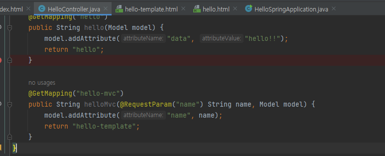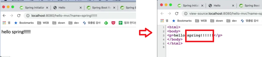 컨트롤러에서 name부분이 name=spring!으로 변경 -> 모델에 담겨 템플릿으로 넘어감