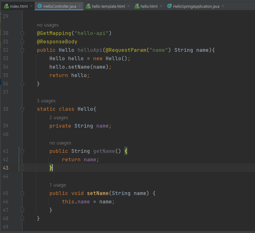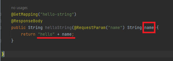 @ResponseBody : Http의 body부분에 데이터( "hello" + name; ) 를 직접 넣어주겠다는 의미
