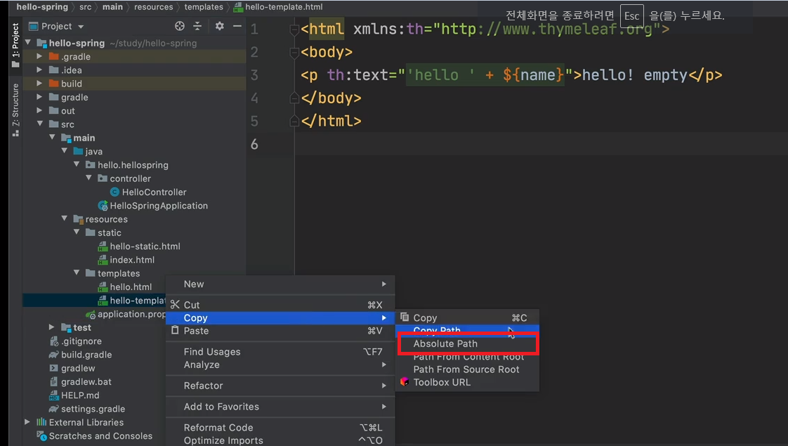 파일 마우스 우클릭 -> Copy Path/ Reference.. -> Absolute Path