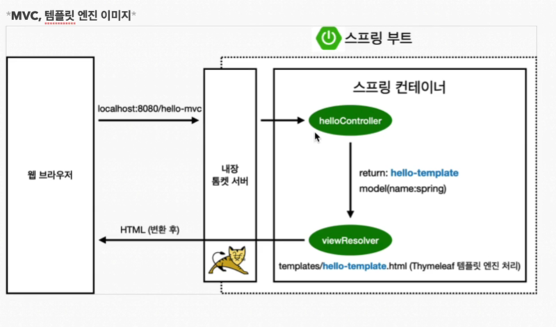 - MVC : 컨트롤러, 모델, 템플릿 엔진(화면)