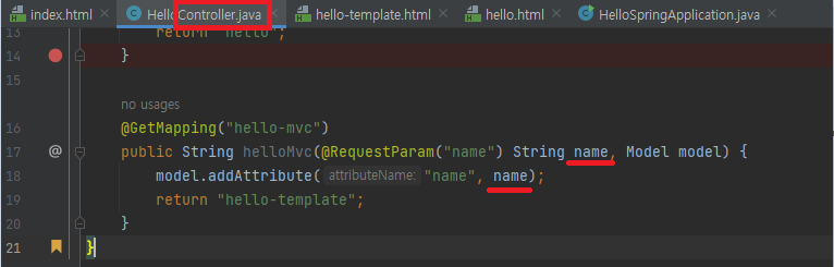 컨트롤러에서 name부분이 name=spring!으로 변경 -> 모델에 담겨 템플릿으로 넘어감