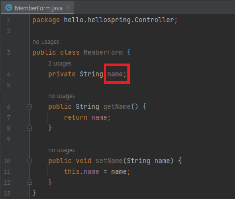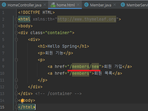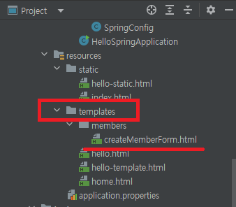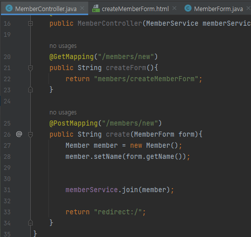 Controller의 members/new를 찾아주고 createForm()이 호출. createMemberForm으로 이동