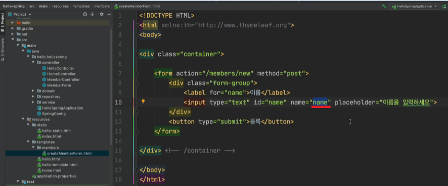 리턴하면 viewResolver를 통해 createMemberForm.html이 선택되고 타임리프 템플릿이 렌더링함.