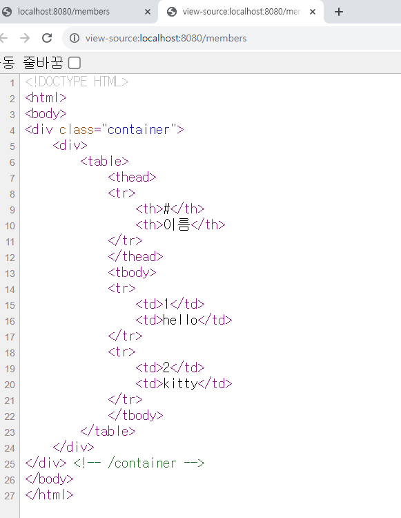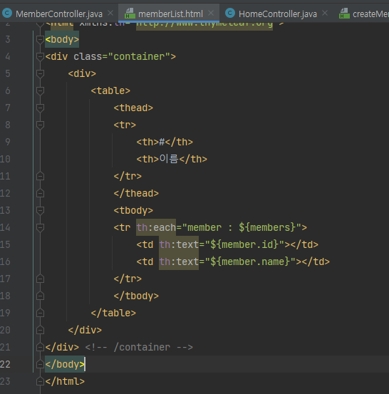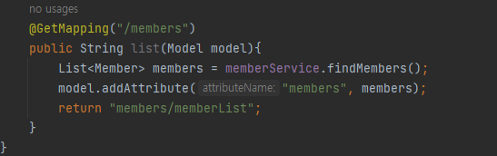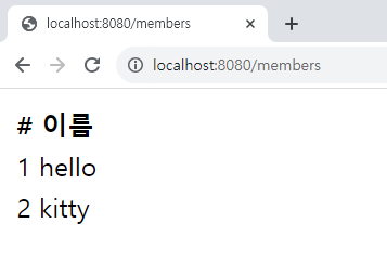 ${members} : 모델안에 있는 값(객체)을 꺼냄 -> member에 담아 id와 name을 출력해줌